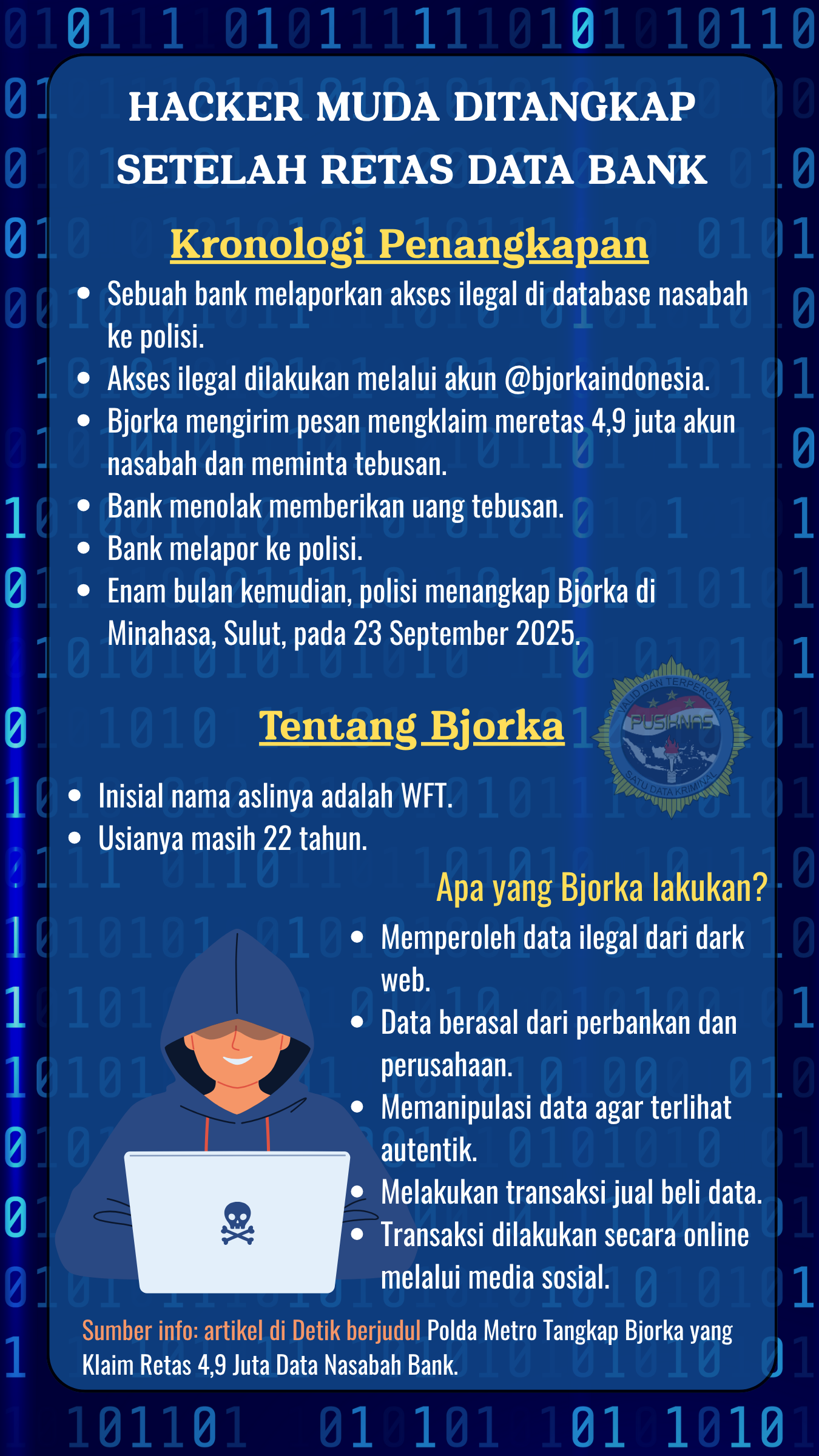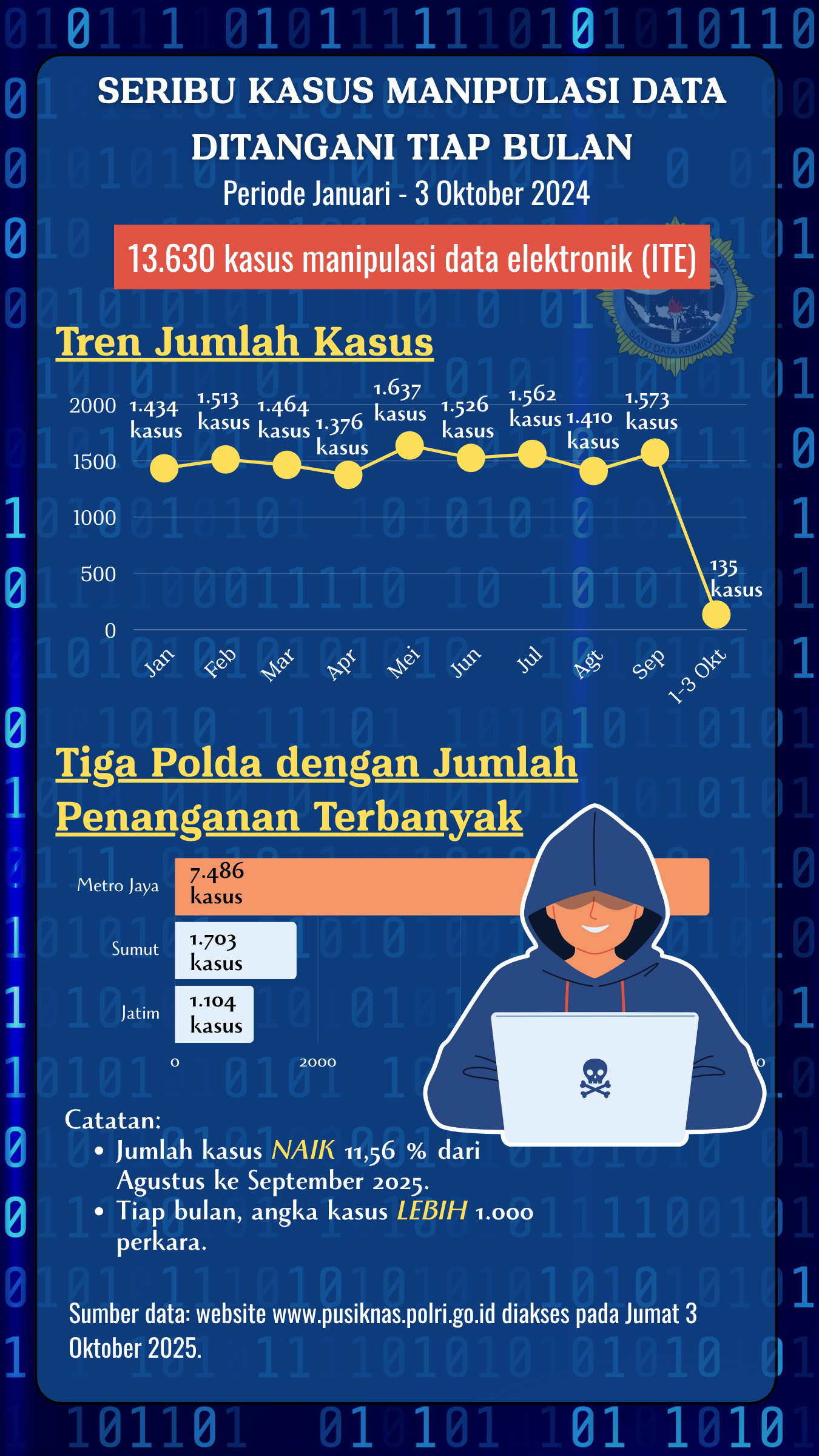 Sebagai informasi, sesuai dengan Undang Undang Nomor 2 Tahun 2002 tentang Kepolisian Negara Republik Indonesia Pasal 15 ayat (1) huruf j, Polri berwenang menyelenggarakan Pusat Informasi Kriminal (Pusiknas). Pusiknas berada di bawah Bareskrim Polri serta berlandaskan regulasi Peraturan Kepolisian Negara Republik Indonesia Nomor 1 Tahun 2024 tentang Pencabutan Peraturan Kepala Kepolisian Nomor 15 Tahun 2010 tentang Penyelenggaraan Pusat Informasi Kriminal Nasional di Lingkungan Kepolisian Negara Republik Indonesia.